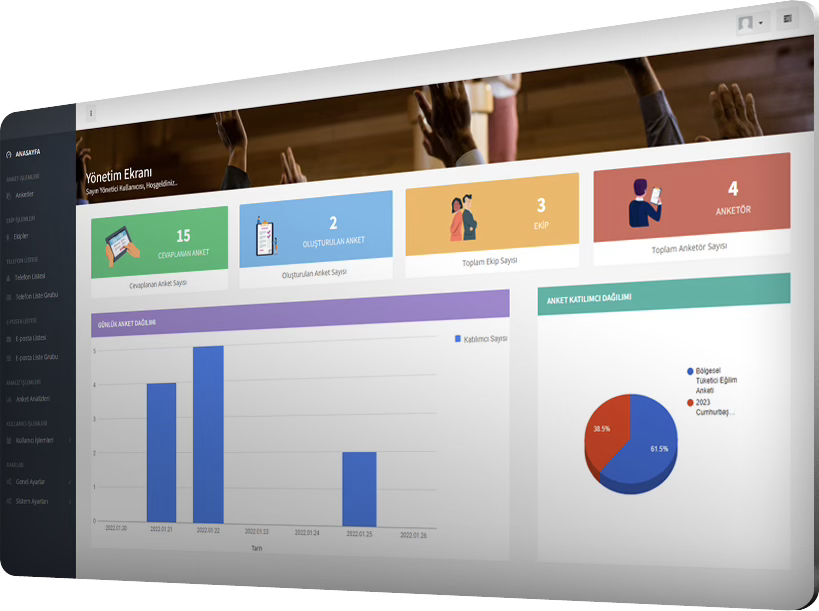 Belediyeniz için vatandaşlara online ya da saha ekibi görevlendirerek anketler yapabileceğiniz, birden fazla soru ekleyebileceğiniz, farklı formatlarda birden fazla cevap oluşturabileceğiniz, detaylı sonuç raporlarının bulunduğu yazılımdır.