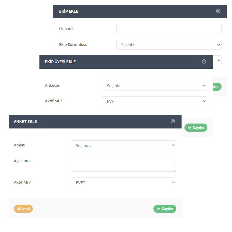 Anket ekipleri oluşturun, ekiplere üyeler ekleyin, ekiplere özel anketler oluşturun.