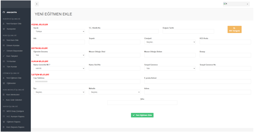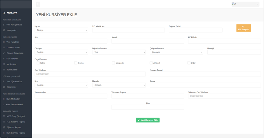 NVI sorgulama servisleri ile entegre, doğru bilgilerle kursiyerlerinizi kaydedebilirsiniz.