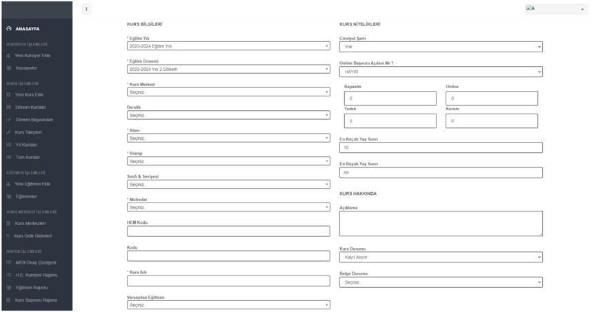 Online başvuru, cinsiyet şartı, yaş sınırı, asil ve yedek kursiyer kapasitesi gibi seçeneklerle yeni kurslar açabilir, bu kursları dönemlere atayabilirsiniz.
