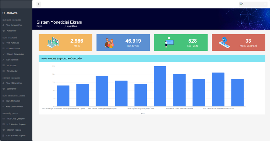 3 ayrı girişten ve modülden oluşan bu sistemde Yönetim Modülü, Kursiyer Modülü ve Eğitmen Modülü bulunmaktadır.