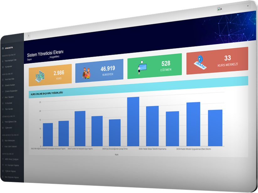 Yönetim ekranı ile kurslarınızı, eğitmenlerinizi, kursiyerlerinizi ekleyin, düzenleyin, kapsamlı bir şekilde yönetin.