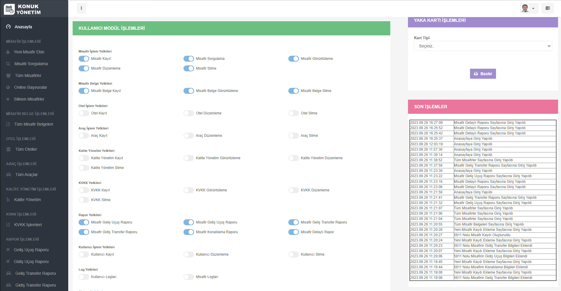 Kullanıcılarınızı detaylı modül yönetimiyle yetkilendirin. Misafir işlemlerinden belge işlemlerine, otel işlemlerinden araç işlemlerine, kaliye yönetiminden kişisel veri yönetimine, raporlara kadar farklı birçok alanda yetki tanımlayabilirsiniz.