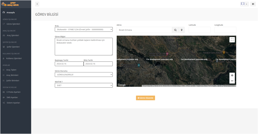 Afet durumlarında istediğiniz araçları, istediğiniz bölgelere görev emri oluşturarak gönderin.