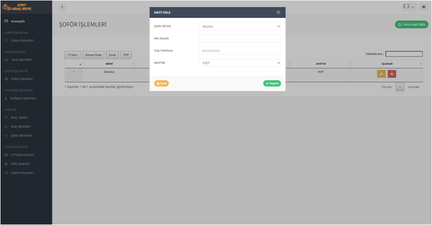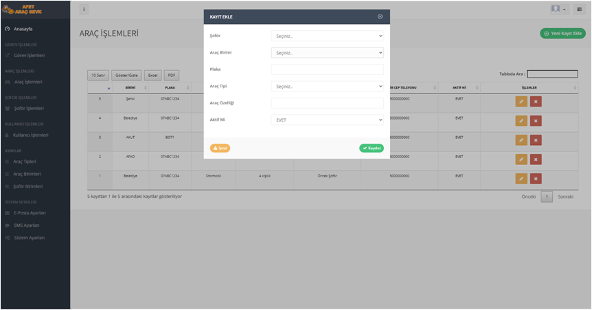 İster kurumunuza ait, ister başka bir kuruma ait tüm araçları ve şoförleri hızlı bir şekilde ekleyin.
