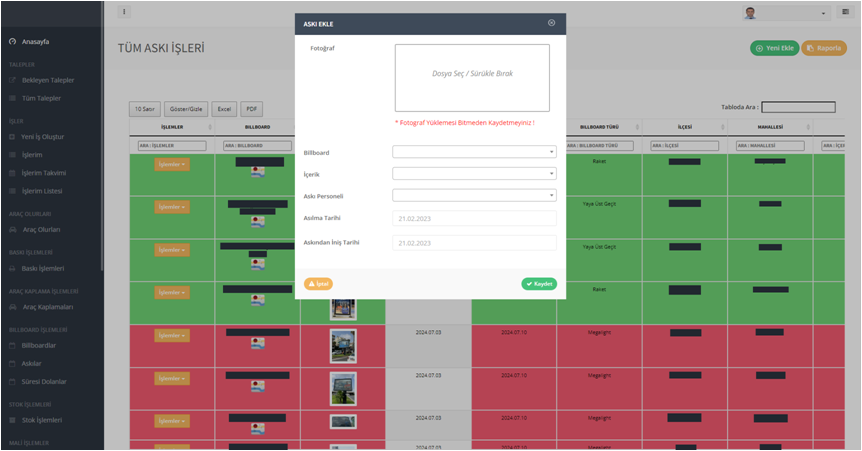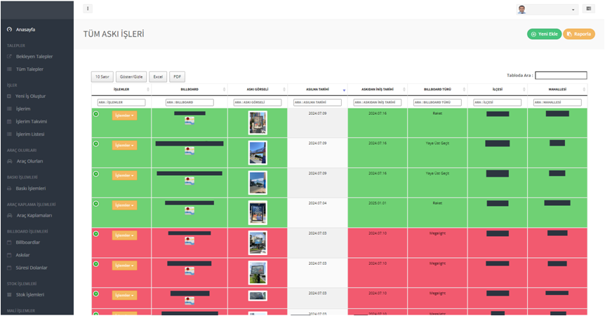 Billboard askılarınızı tek bir ekrandan takip edin, askı süresi dolan içerikler ekranda otomatik olarak kırmızı olarak görüntülenir, bu sayede billboard askılarınız sürekli güncel kalır.
